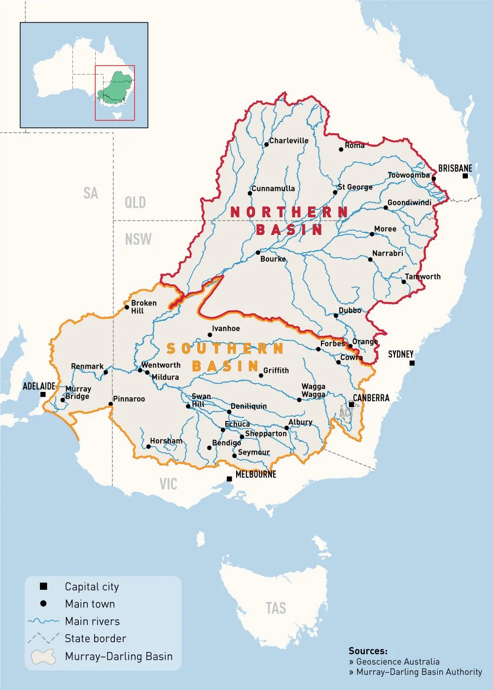 The Murray Darling Basin is a large area throughout south-eastern Australia where water flows through two major rivers and lakes.